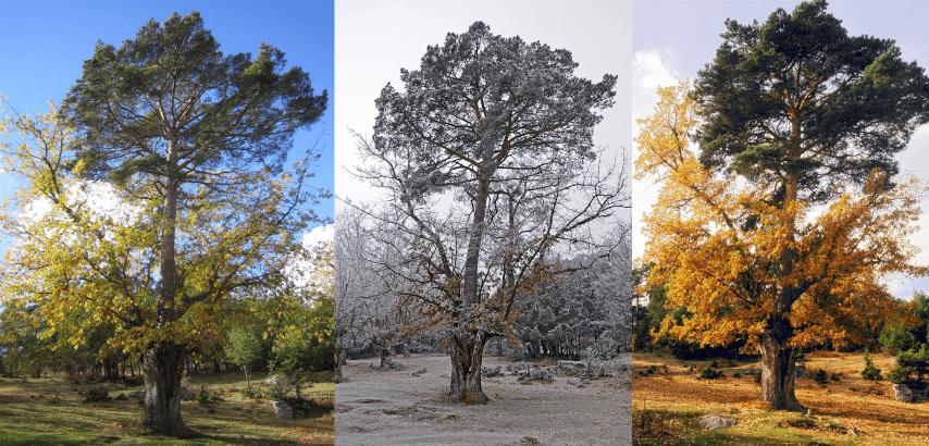 The tree attracts visitors throughout the year, as each season reveals a different aspect of its uniqueness. In spring, the dark green needles of the pine contrast with the fresh buds of the oak. In summer, various shades of green blend together in the canopy. In autumn, the oak’s leaves turn a striking colour, while in winter the oak loses its foliage entirely, leaving the evergreen pine standing in vivid contrast.